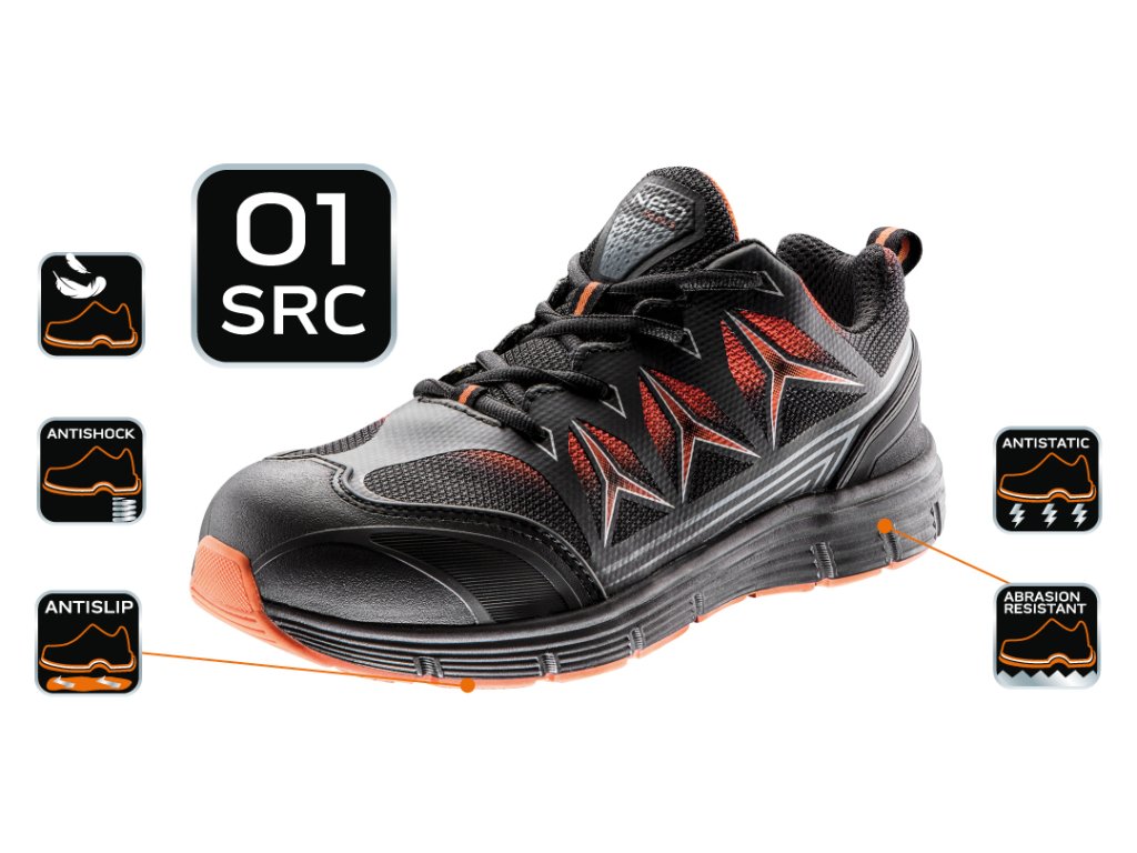Pracovné poltopánky O1, bez kovu, zvršok z plastu, sieťková vnútorná povrchová úprava, podošva zhotovená z gumy a vstrekovanej peny EVA, antistatická stielka, zabudovaná päta, absorpcia energie v oblasti päty, odolnosť podošvy voči olejom, benzínu a iným organickým rozpúšťadlám (uhľovodíky), spĺňa požiadavky normy EN ISO 20347:2012 SRC FO O1, (SRC – odolnosť voči pošmyknutiu na keramickom podklade s vrstvou roztoku laurylsulfátu sodného (SLS) a na podklade z ocele s vrstvou glycerolu), certifikát CE