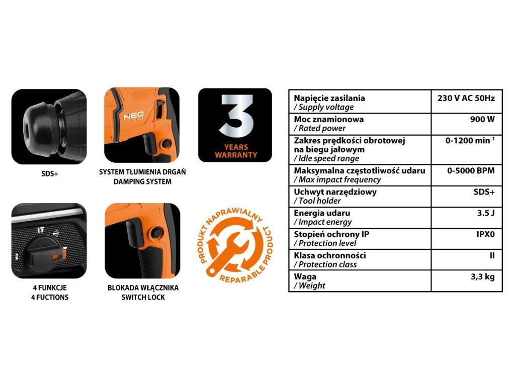 Klíčovou výhodou vrtačky značky NEO TOOLS je energie úderu 3,5 J, která zaručuje efektivní vrtání a kování i v tvrdých materiálech. Systém SDS Plus zase umožňuje rychlou a pohodlnou výměnu vrtáků. Díky tlumení vibrací a 4 pracovním funkcím – včetně vrtání a kovářství – nabízí toto zařízení všestrannost a vysoký komfort používání.