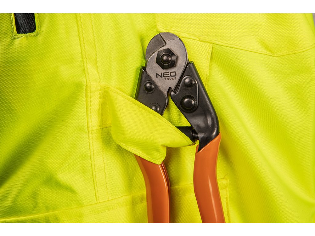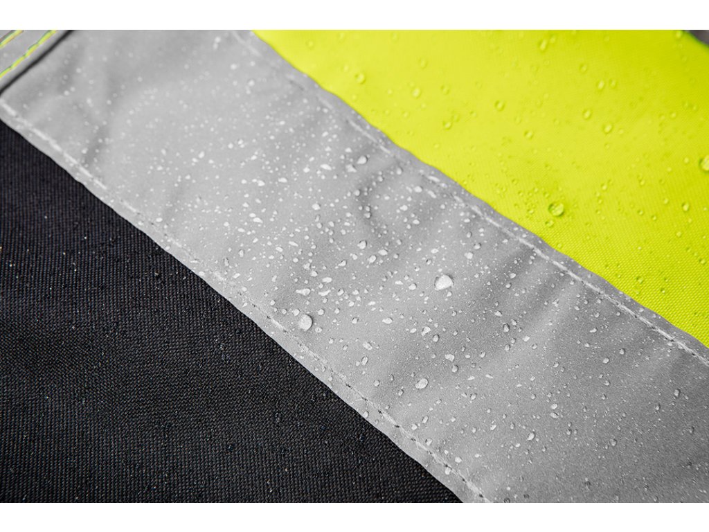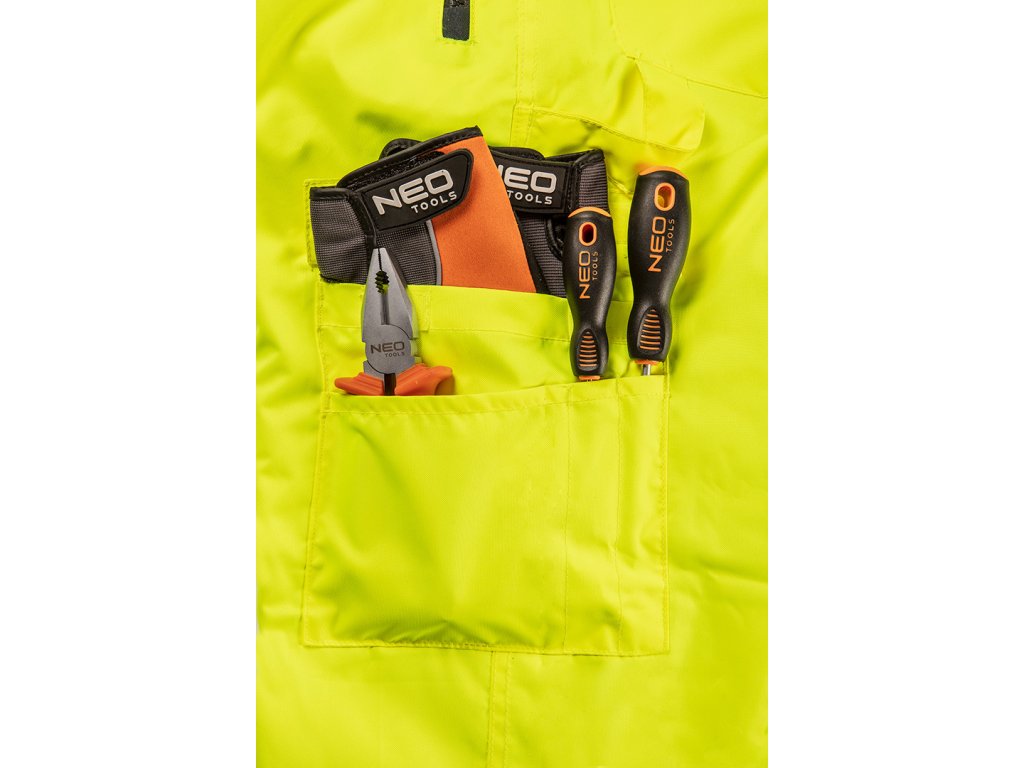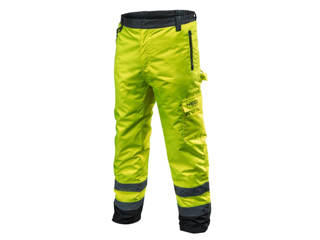 Zateplené pracovní kalhoty NEO s vysokou viditelností vyrobené z vysoce kvalitní a odolné tkaniny Oxford 300D. Kalhoty s vysokou viditelností jsou praktickým řešením, které zvyšuje bezpečnost uživatele tím, že signalizuje jeho přítomnost za všech denních podmínek a za tmy s osvětlením vozidla. Vyrobeno z odolného voděodolného fluorescenčního materiálu a reflexních prvků zajišťujících viditelnost odpovídající třídě 1 v souladu s požadavky normy PN-EN ISO 20471: 2013. Zateplení z lehkého polyesteru zajišťuje pohodlí v chladných dnech. Podlepené švy a 1000 mm nepromokavý materiál vám umožní pracovat i v dešti. Elastické gumičky v pase usnadňují nastavení velikosti. Robustní kapsy a praktický držák na nářadí vydrží i velké zatížení a uloží veškeré potřebné nářadí. Kvalitu zaručuje evropský certifikát a provedení podle normy EN ISO 13688: 2013.